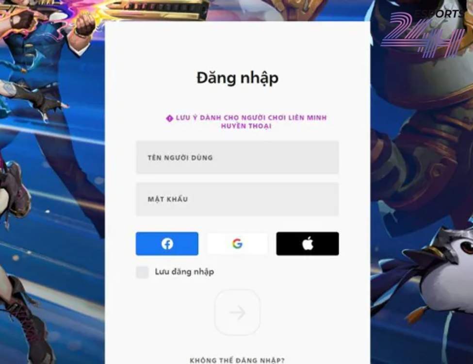 Nhập tên người dùng (Username) và mật khẩu để đăng nhập. Lưu ý: đây là tên đăng nhập bảo mật, KHÁC với Riot ID hiển thị công khai.