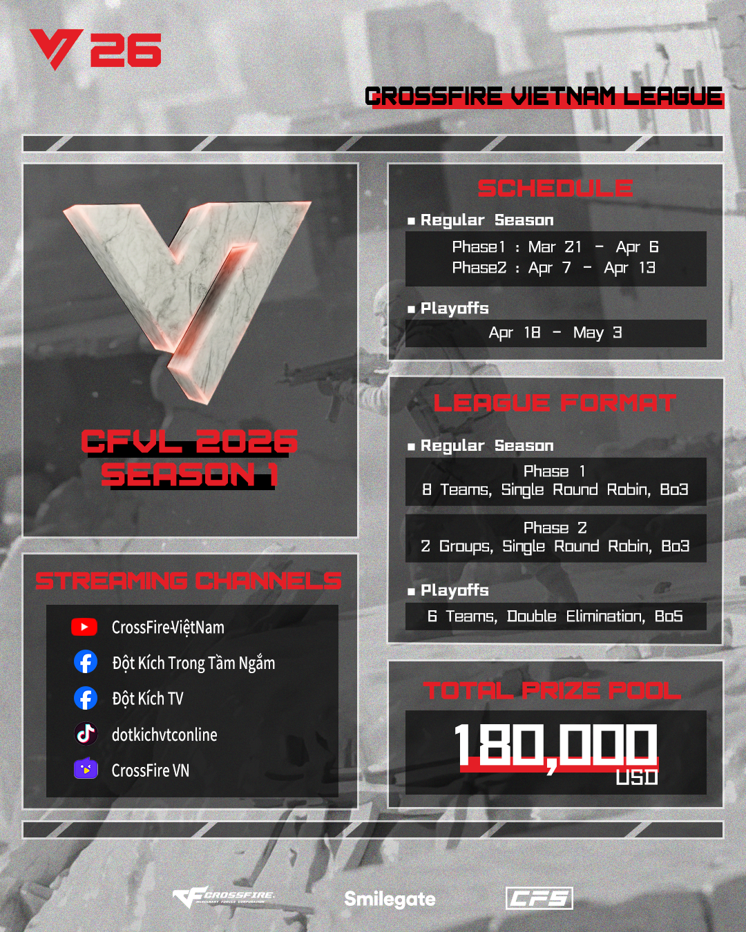 Giải đấu CROSSFIRE Vietnam League (CFVL) 2026 Mùa 1 sẽ chính thức khởi tranh vào tuần tới, bắt đầu từ ngày 21/03. Với sự tham gia của 8 đội tuyển cùng thể thức thi đấu mới, mùa giải năm nay hứa hẹn sẽ mang đến những màn so tài vô cùng kịch tính.